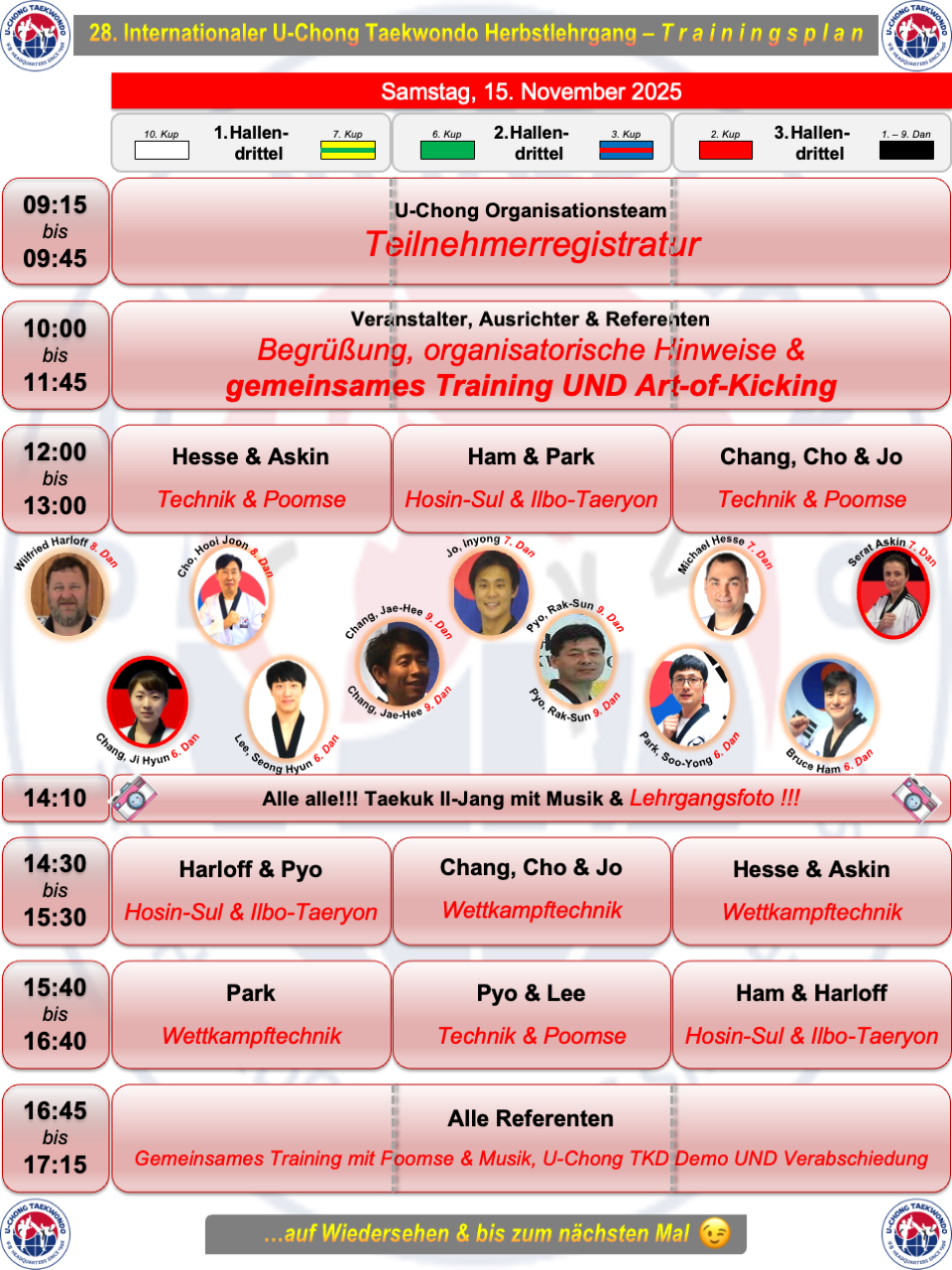 Aber jetzt ist es so weit: Hiermit laden wir euch offiziell zu unserem 28. U-Chong Herbstlehrgang am Samstag, 15. November 2025 ein. Gastgeber sind auch dieses Jahr wieder die Sportfreunde Harteck e.V. als Mitglied der U-Chong Taekwondo Community – an dieser Stelle bereits ein herzliches Dankeschön!!!